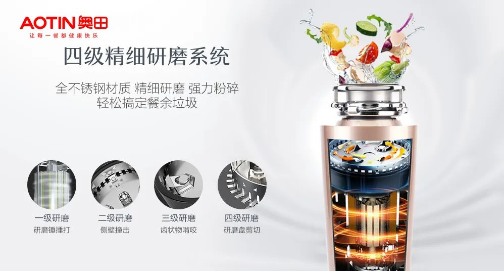 我们经常在市面上可以看到几级研磨,一般来说级数越高,研磨能力越是强悍。奥田垃圾处理器LD550-A四级精细研磨系统已属于高水准,高效研磨,研磨细度高,残渣剩饭不在话下,轻松搞定厨余垃圾。